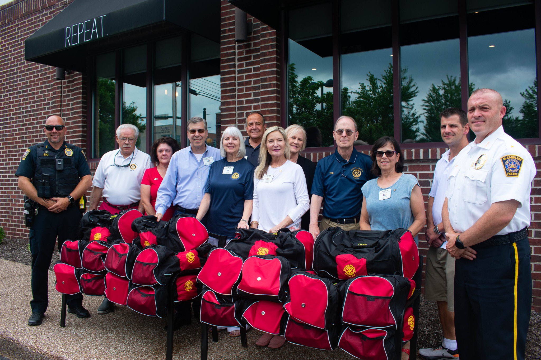 During today’s meeting at Walnut Grill in Wexford, we presented 20 fully stocked Comfort Bags to the McCandless Police. These bags—filled with toiletries, socks, snacks, blankets, and more—will be distributed to individuals who are suddenly displaced from their homes and in need of immediate care and support.